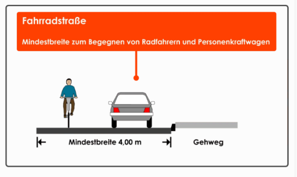 Die unten dargestellten Bilder sind aus der Urteilsbegründung zum Urteil des VG Hannover 7. Kammer, Urteil vom 13.08.2021 zu Fahrradstraßen . Als Quelle wird https://www.stvo2go.de/breite-fahrradstrasse/ angegeben.