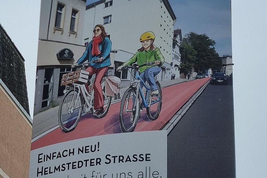 Die ersten Konturen der neuen Veloroute an der Helmstedter Straße zeichnen sich ab. Eine Plakataktion von ADFC und VCD weist auf die Vorteile der Veloroute hin. Es gibt Verbesserungen für alle Verkehrsteilnehmende. Vom Fuß-u.Radverkehr bis zum ÖPNV.