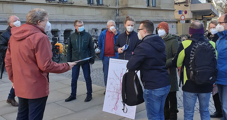 Übergabe des Veloroutenplans durch die Fahrradverbände an die Verwaltung der Stadt Braunschweig, vertreten durch den Baudezernenten Herrn Leuer.